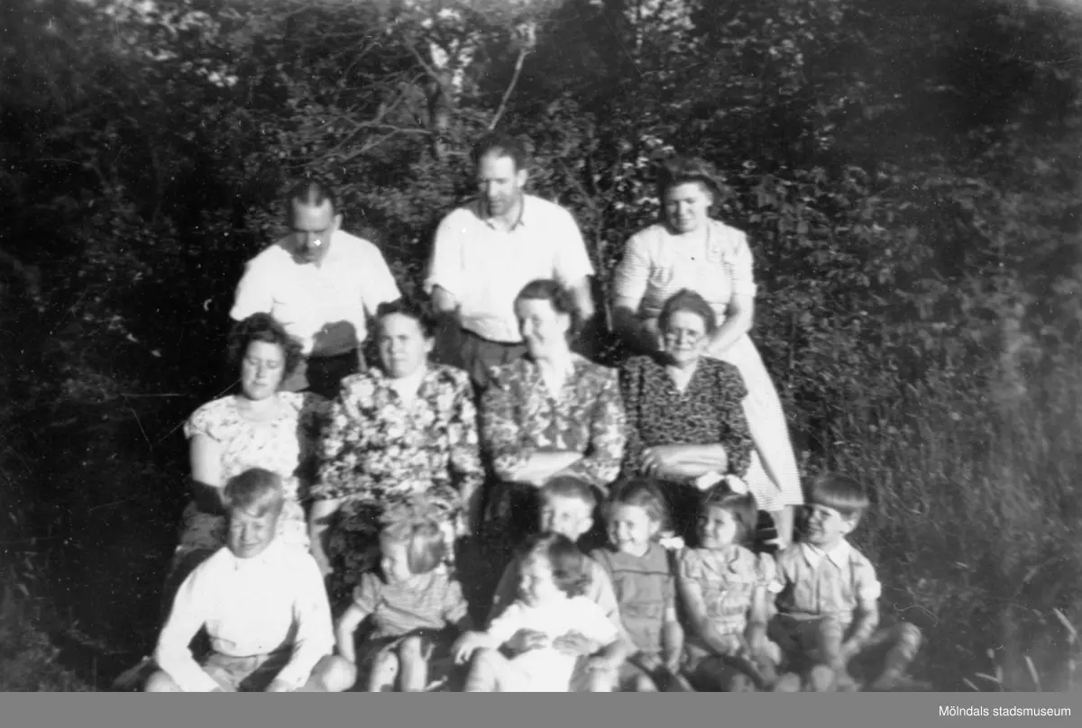 Släktingar och grannar fotograferade i närheten av "Byggninga" (gamla brandstationen) i Lindome sommaren 1950. De var textilarbetare vid August Werners spinneri och färgeri.