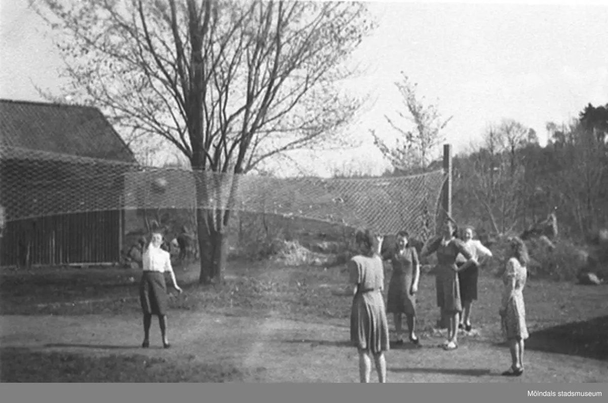 Estländska flickor spelar vollyboll på fabriksområdet i slutet av 1940-talet. Hösten 1944 flydde 32.000 estländare från kriget i Estland till Sverige. Ett sextiotal personer tog jobb på August Werners textilfabrik i Lindome.