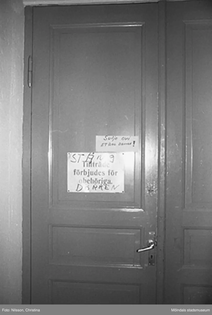 Byggnadsdetaljer: Dörr med skylt "Tillträde förbjudet för obehöriga, stäng dörren." August Werners fabriker i Lindome, hösten 1994.