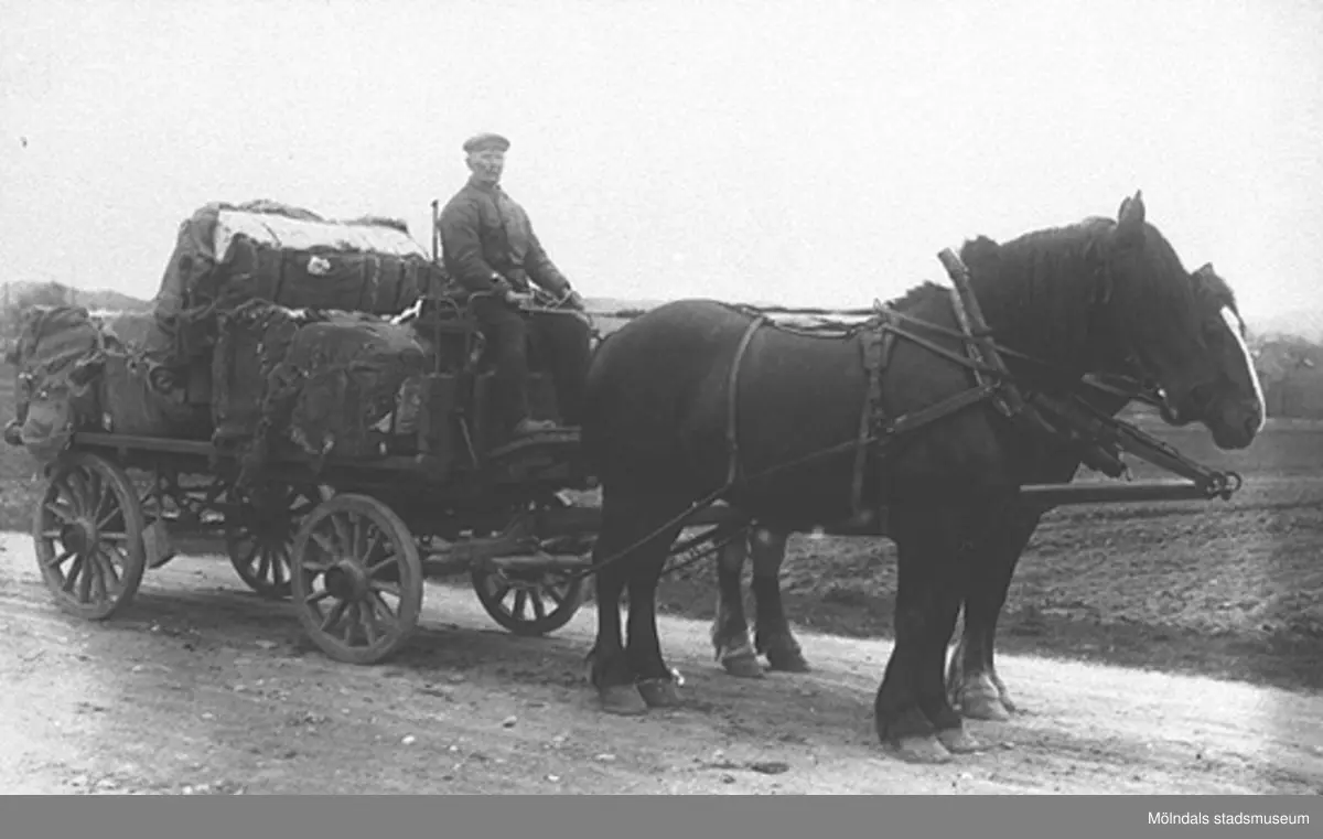 August Börjesson kör häst och vagn med bomullsbalar från Göteborg till spinneriet i Annestorp. Okänt årtal. Hösten 1944 flydde 32.000 estländare från kriget i Estland till Sverige. Ett sextiotal personer tog jobb på August Werners textilfabrik i Lindome.