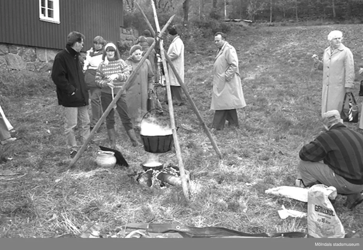 Familjesöndag vid Börjesgården, 1994-05-15. Museichef Mari-Louise Olsson (med vitt hårband) står vid en öppen eld och samtalar med besökare.