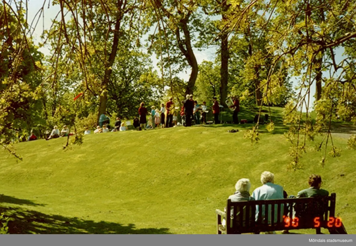 Personer som vistas i Gunnebo slottspark, maj 1990.