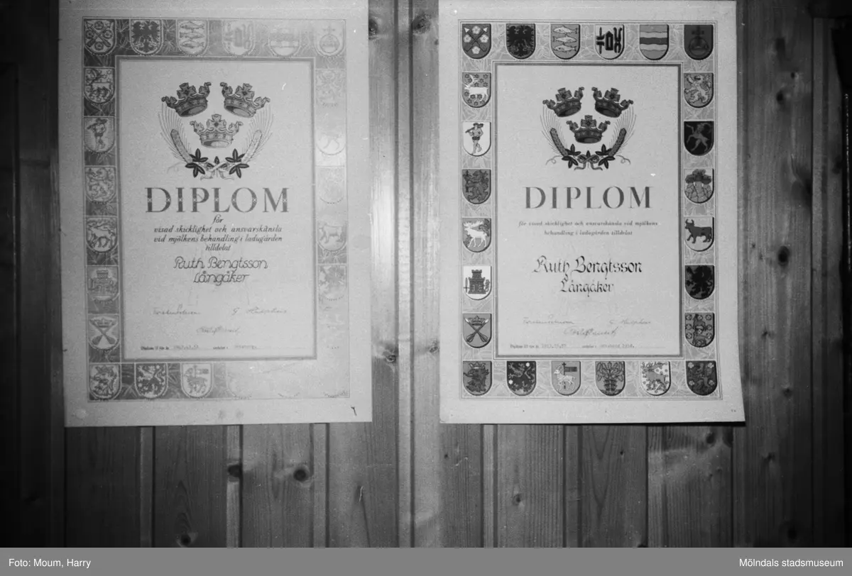 Två diplom utfärdade till Ruth Bengtsson hängandes på väggen i hembygdsgården i Långåker, Kållered, år 1983.