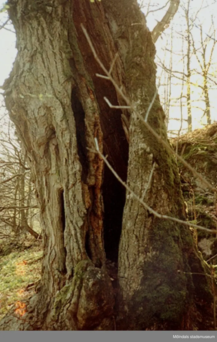 Del av en trasig trädstam vid Gunnebo slott, april 1990.