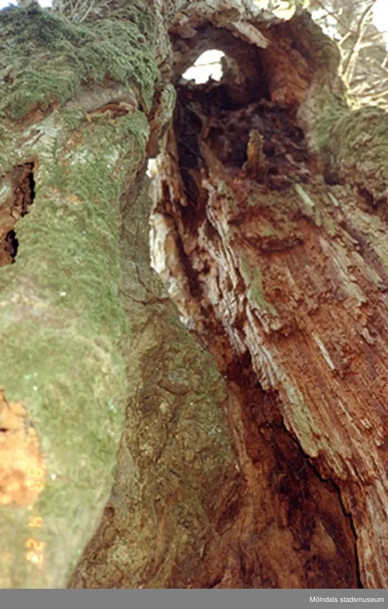 Närbild på ett skadat träd utanför Gunnebo slott, april 1990.