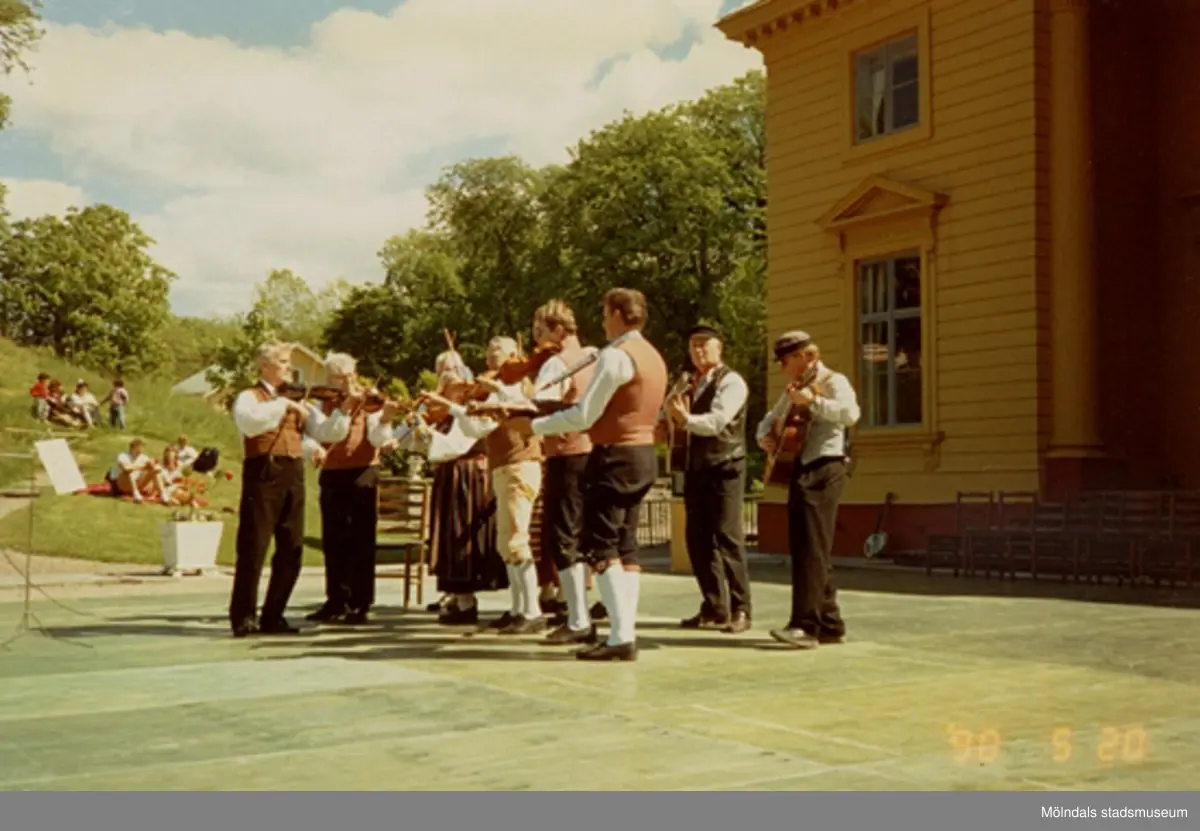 Ett folkdanslag uppträder inför publik utanför Gunnebo slott, maj 1990.