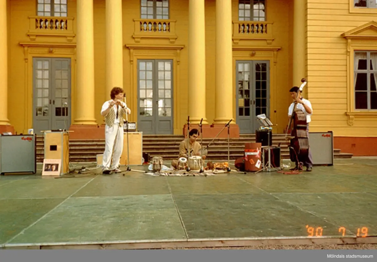Musiker som spelar på scenen framför Gunnebo slott, juli 1990.
