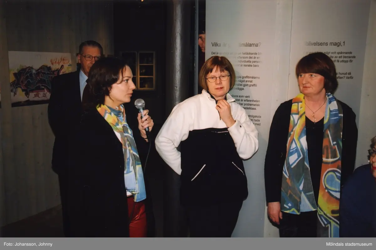 Invigning av utställningen "Alltså finns jag" på Mölndals museum år 2003. Visning av utställningen skedde av konstpedagog Karin Lundmark från Bohusläns museum, som här håller i mikrofonen, samt arkeolog/pedagog Anna Bratås från Vitlycke museum (ej i bild). Till höger ses museichef Mari-Louise Olsson. En okänd man skymtas i bakgrunden till vänster.