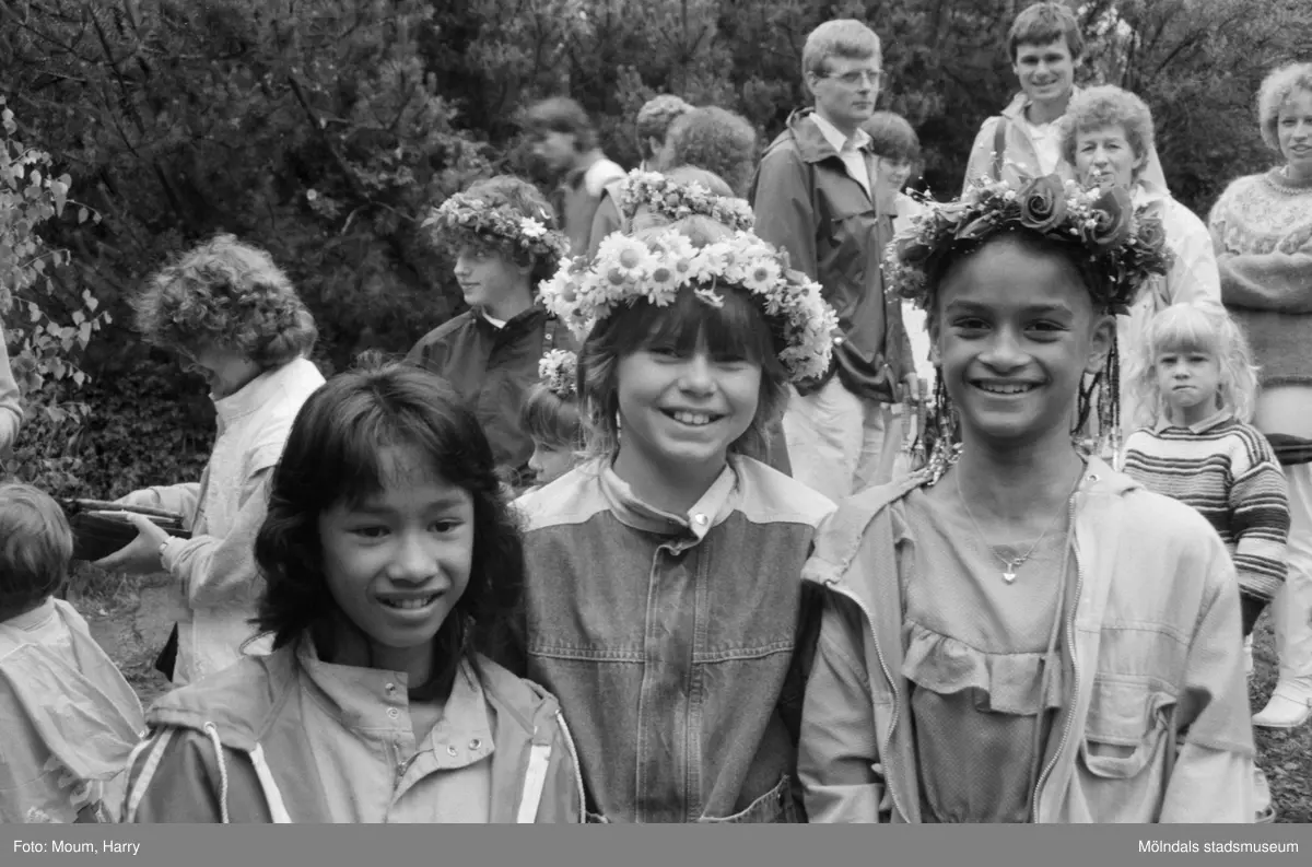Midsommarfirande i Bunketorp, Lindome, år 1984. "Vid midsommardansen i Bunketorp med rätt så mycket folk kring midsommarstången trivdes storfint Linda, Pia och Camilla trots ruskvädret."