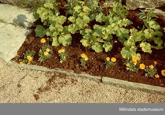 En grusväg vid plantor i en blomsterrabatt. Gunnebo slottsträdgård, juni 1990.