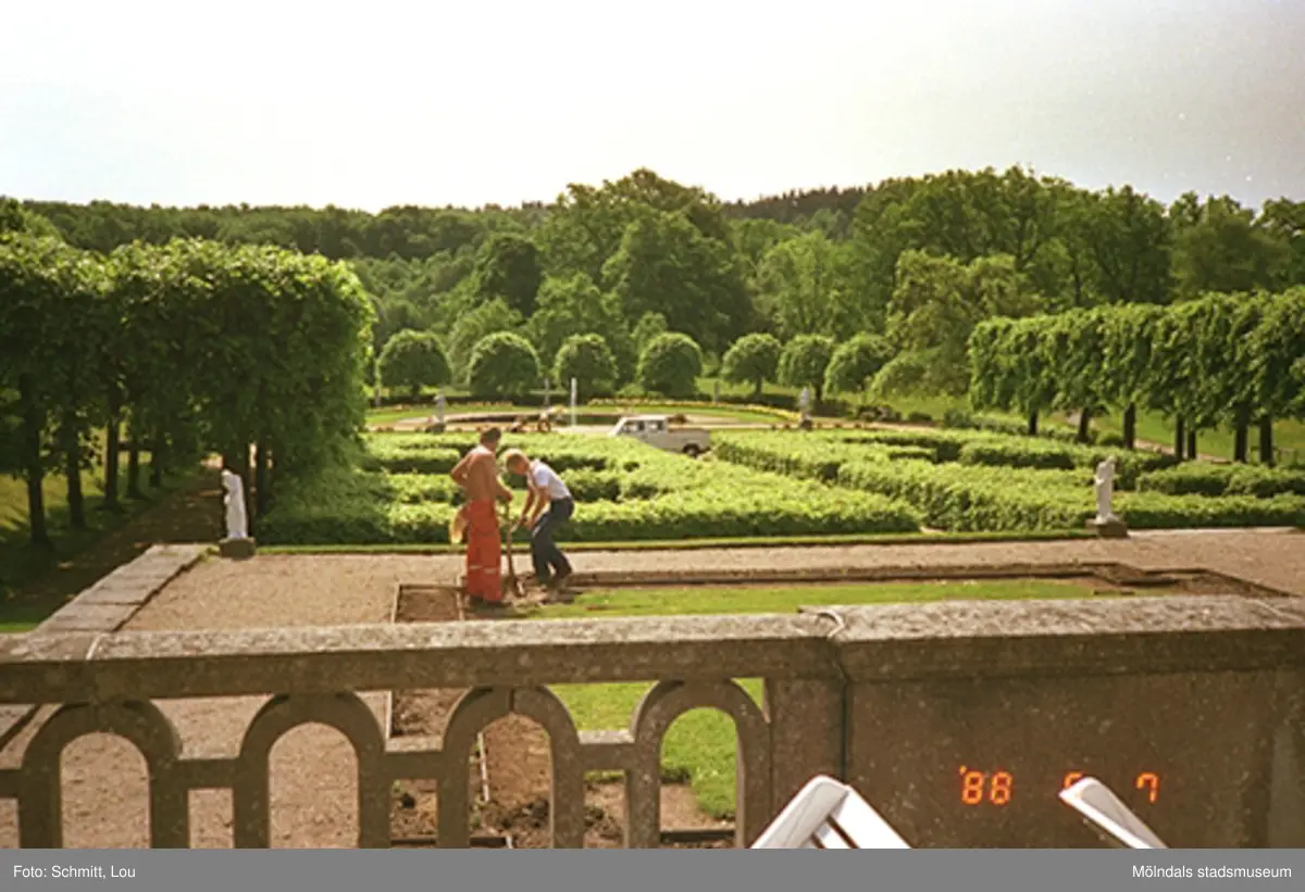 Två män gräver i trädgården mot Gunnebo slotts baksida/park.