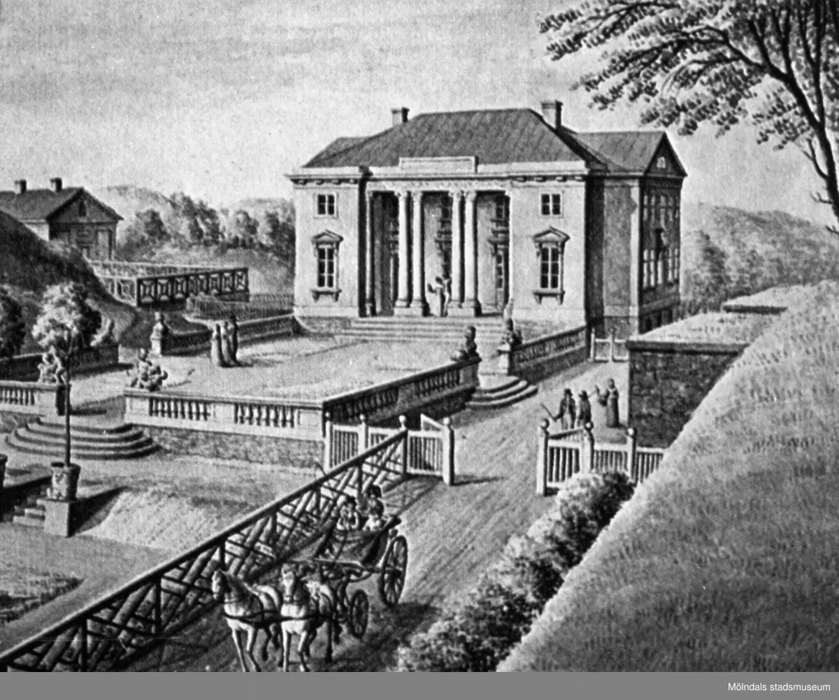 Gunnebo slotts norra sida. Avfotograferad bild från Evert Lundströms bok. Föreställer originalakvarell av J. F. Weinberg.