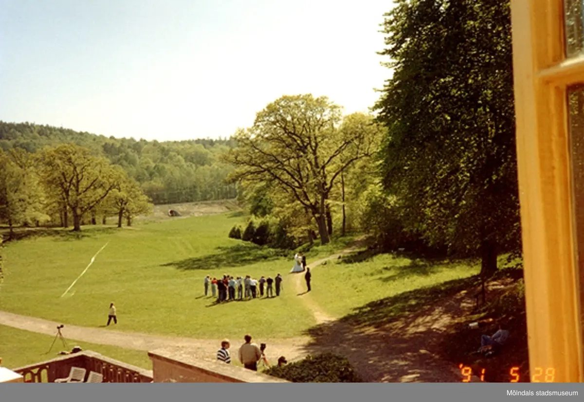Landskapsbild på ett bröllop och deltagande gäster i Gunnebo slottspark, maj 1991.