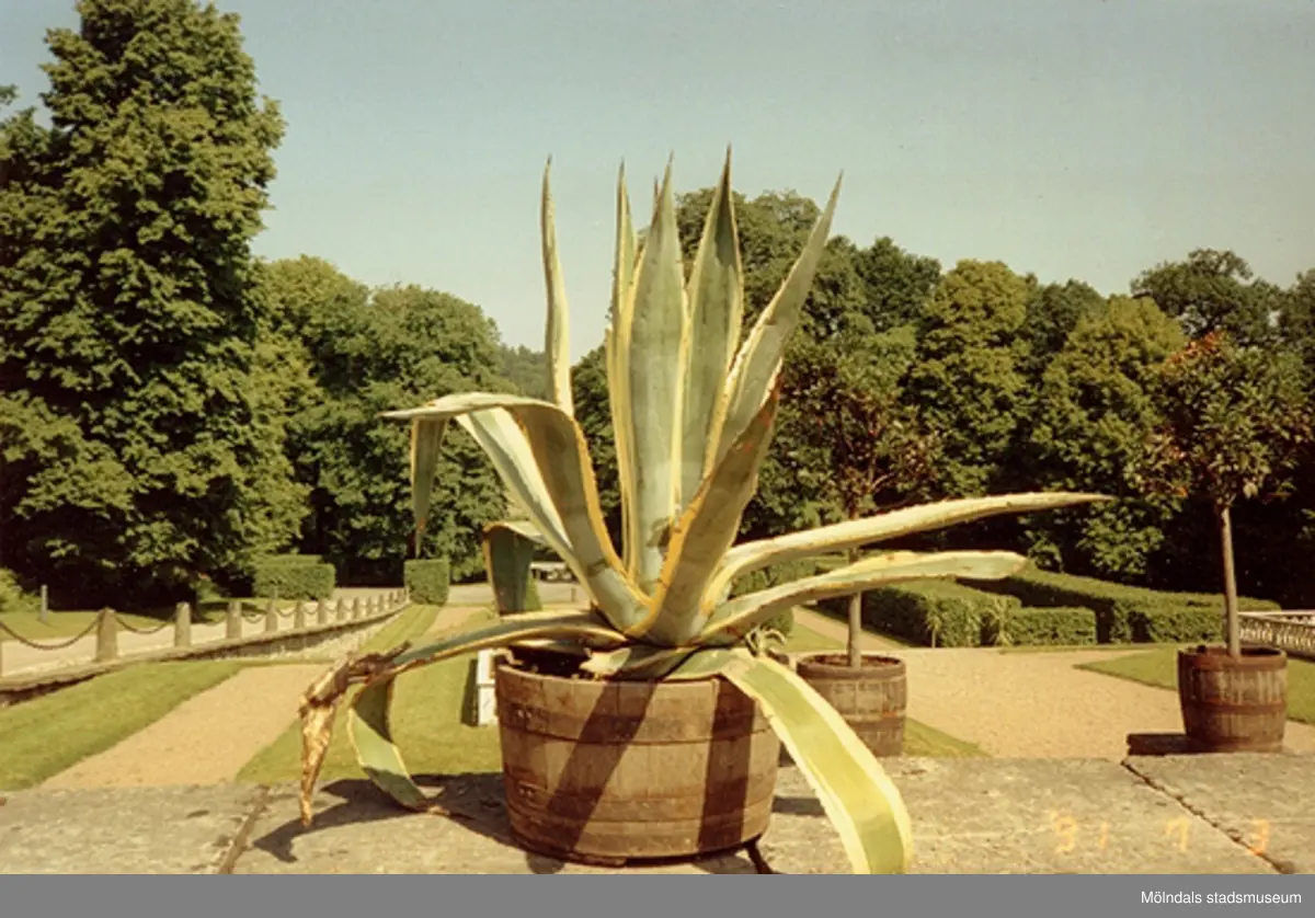 Ett blomkruka med Agave placerad på en stenmur utanför Gunnebo slott, juli 1991.