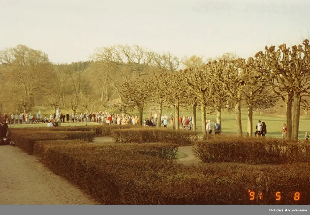Landskapsbild med en grupp människor i Gunnebo slottspark, maj 1991.