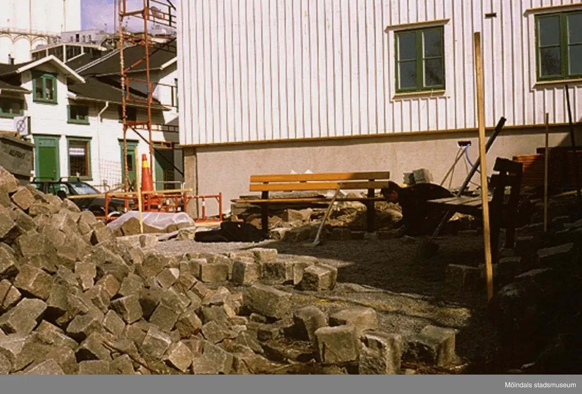 Stensättning vid Lyktplatsen, Norra Forsåkersgatan i Kvarnbyn, april 1993. Kråkans Krog skymtas i bakgrunden. Till höger ses Korndal 2 (Götaforsliden 4).