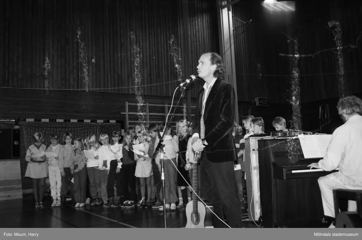 Vissångaren Alf Hambe uppträder på Ekenskolan i Kållered, år 1983. "Alf Hambe sjöng med en bakgrundskör från Kållered."