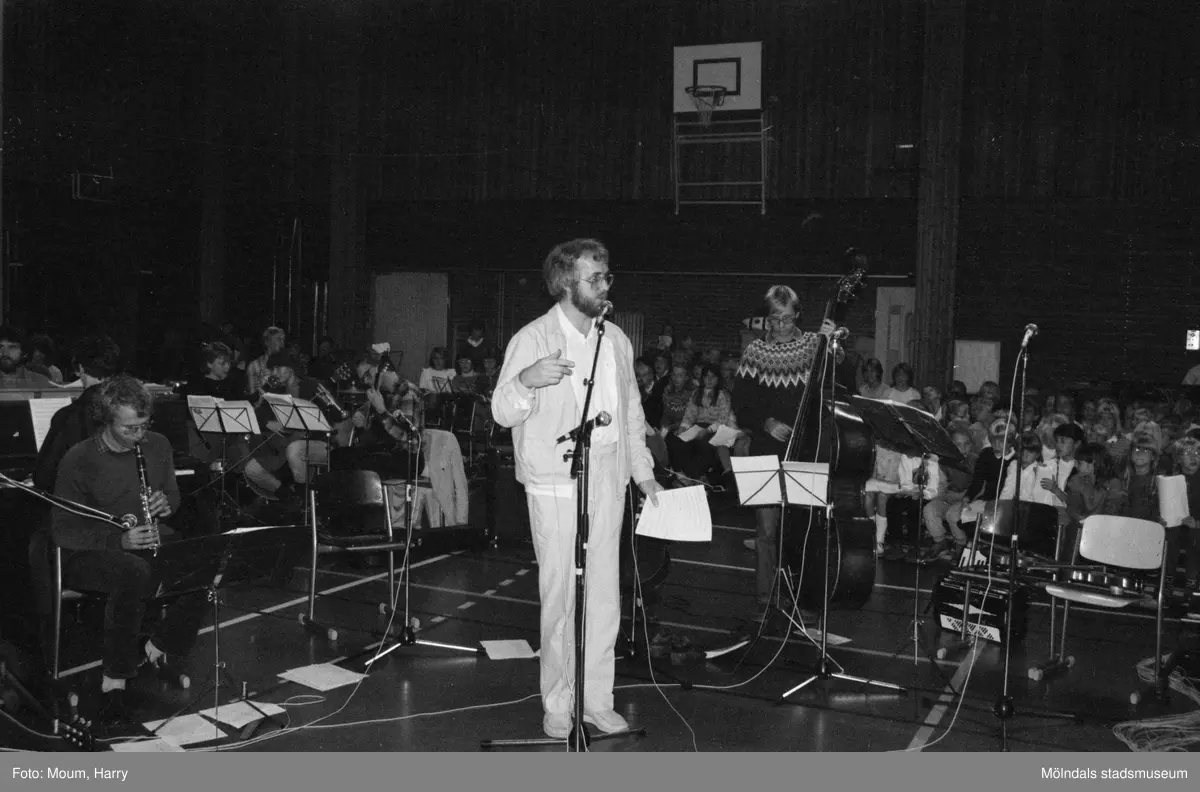 Vissångaren Alf Hambe uppträder på Ekenskolan i Kållered, år 1983. Musikskolans Jan Ivar Blixt.