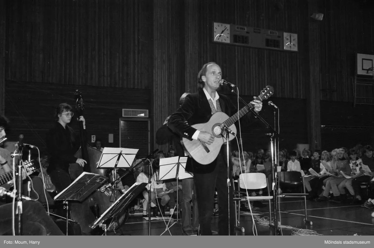 Vissångaren Alf Hambe uppträder på Ekenskolan i Kållered, år 1983.