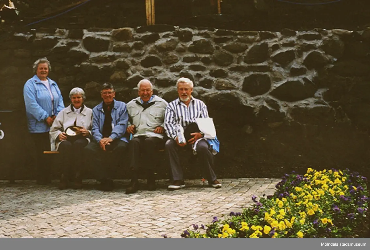 Gatlyktan invigs på Kvarnbydagen 25/4 1993. Fem personer står vid eller sitter på en bänk framför en mur vid Lyktplatsen i Kvarnbyn. Fjärde person från vänster är Vigon Olsson och till höger om honom sitter Sven Johnson.