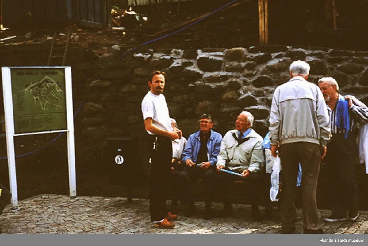 Män och kvinnor vid en bänk på Lyktplatsen i Kvarnbyn. Gatlyktan invigs på Kvarnbydagen 25/4 1993. Sittande, tredje person från vänster är Vigon Olsson. Stående längst till höger är Sven Johnson.