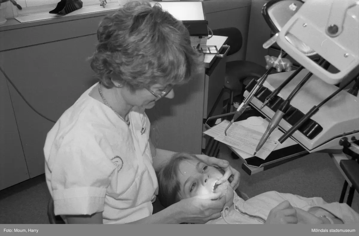 Öppet hus på Lindome vårdcentral under landstingets dag, år 1985. "Tandläkare Agneta Bengtsson provar tandställning på Caroline Johansson."