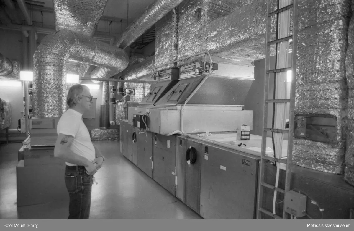 Fläktsystemet på Ekenskolan i Kållered, år 1984. "Det är inga dåliga dimensioner på fläktsystemet i Ekenskolan. Kent Sjöholm kollar upp att allt löper normalt."