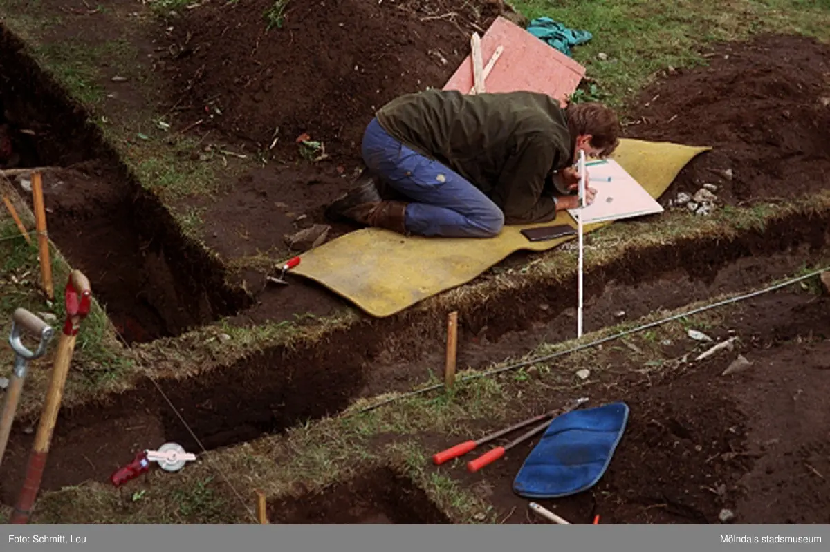 En arkeolog i arbete. Drivhus "B", arkeologisk utgrävning vid Gunnebo slott, september 1995.