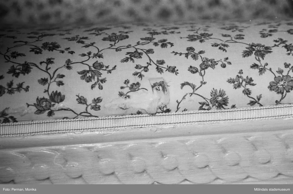 Antikvarisk storstädning på Gunnebo slott 1992. Delvis fotograferad blommig stolsits och stolkarm.