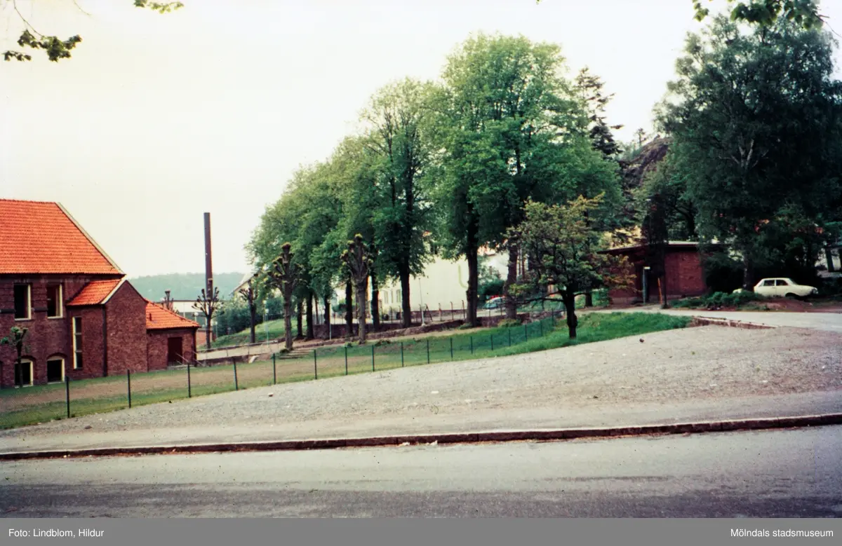 Trädgårdsgatan, nuvarande Störtfjällsgatan, sedd från Alléen. Mölndal, 1970-tal. Till vänster ses del av Kvarnbyskolan.