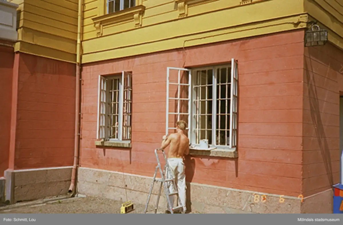 En man som målar ett fönster utomhus på Gunnebo slott.