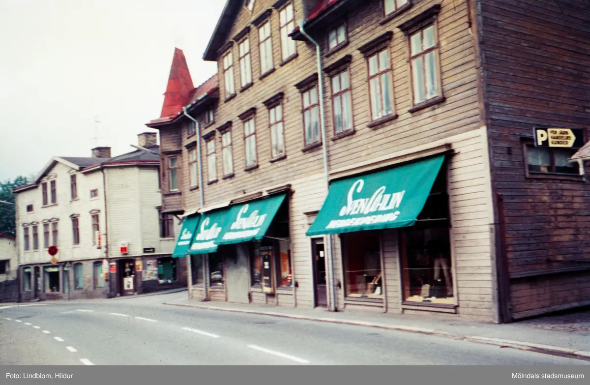 Bebyggelse vid Kvarnbygatan i Mölndal, 1970-tal. Till vänster ses nr 23, Eneborg, med tobaksaffär och kemikalieaffären Stella i gatuplanet. Till höger ses nr 25, Fridtuna, med Sven Ahlin Herrekipering i gatuplanet.