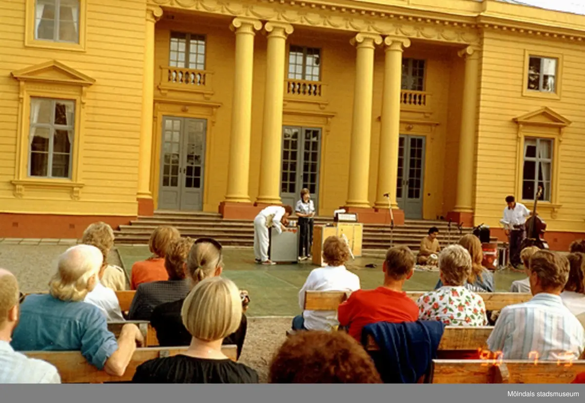 Publiken lyssnar på föreläsning, som pågår framför slottet, juli 1990.