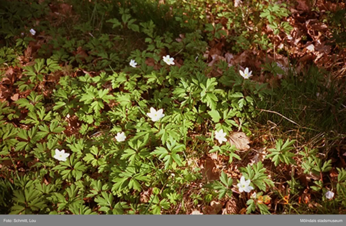Närbild på några utslagna vitsippor som växer på Gunnebo slotts marker.