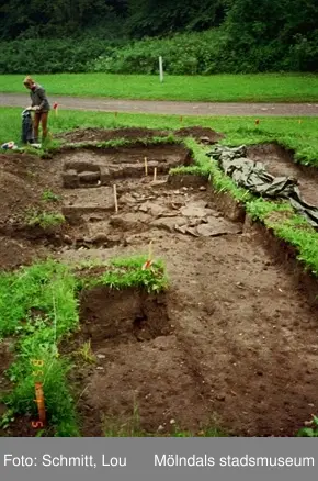 Vy på ett utgrävningsschakt i Gunnebo slotts köksträdgård "A", augusti 1995.