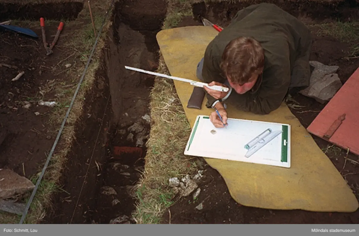 Arkeolog läser en ritning. Drivhus "B" som har arkeologisk utgrävning vid Gunnebo slott, september 1995.
