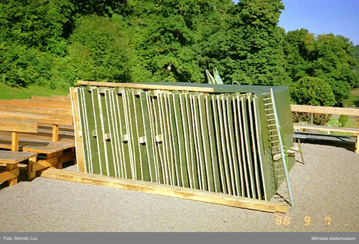 Träbänkar och annat scenmaterial till arrangemang på Gunnebo.