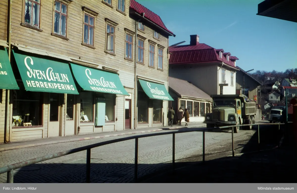 Vy från Papyrus port mot byggnader vid Kvarnbygatan i Mölndal, 1960-1970-tal. Närmast ses från vänster Sven Ahlin Herrekipering med adress Kvarnbygatan 25 och C.J. Johanssons Järnhandel med adress Kvarnbygatan 27.