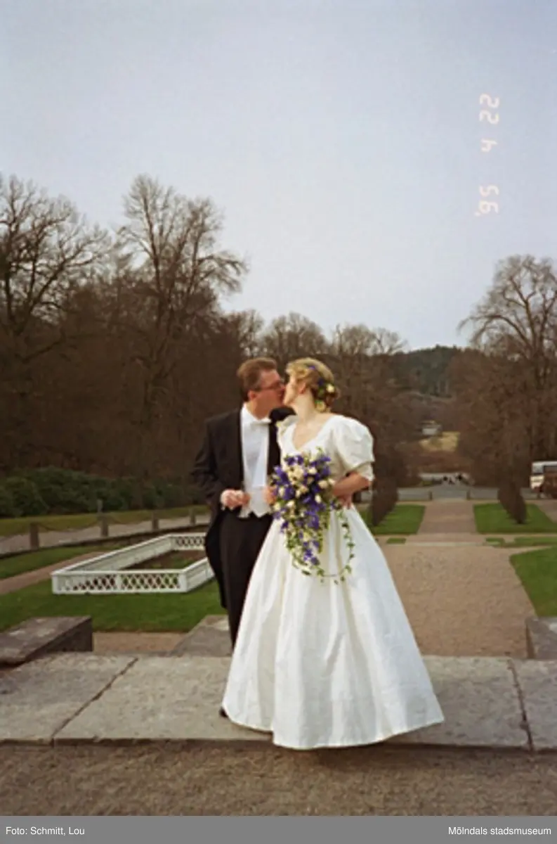 Ett kyssande brudpar, ståendes utomhus för fotografering. Gunnebo slotts norra sida, maj 1995. Relaterande foton: 1996_0033-1996_0034.