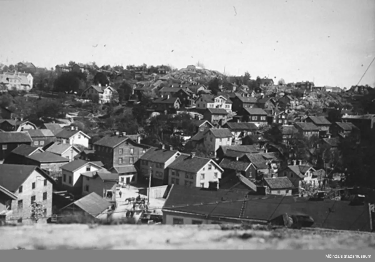 Vy från Störtfjället över Forsebron och Fäberget (Roten M) i Mölndals Kvarnby, okänt årtal.