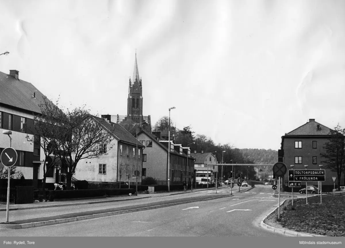 Bebyggelse längs Storgatan i Mölndal i riktning mot norr. I bakgrunden ses Fässbergs kyrka.