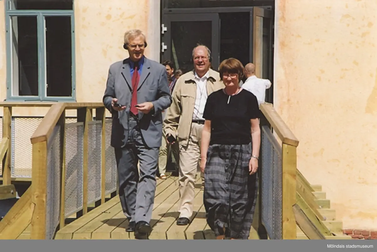 Finansminister Bosse Ringholm besöker Mölndals nya museum på Kvarnbygatan 12 strax innan museets invigning sommaren 2002. Med på bild finns också Ralf Lorentzon och museets chef Mari-Louise Olsson. De promenerar från museet på bron, som leder över Kvarnfallet, utrustade med hörlurar och museets prisbelönta Digitalguide (relaterat motiv: 2007_0220).