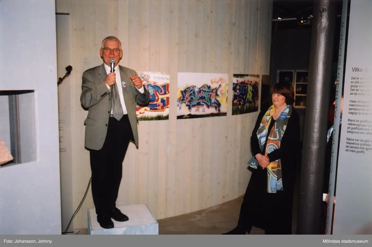 Professor Lars Nordström, ordförande i Västra Götalands Kulturnämnd, håller tal vid invigningen av utställningen "Alltså finns jag" på Mölndals museum, år 2003. Till höger ses museichef Mari-Louise Olsson.