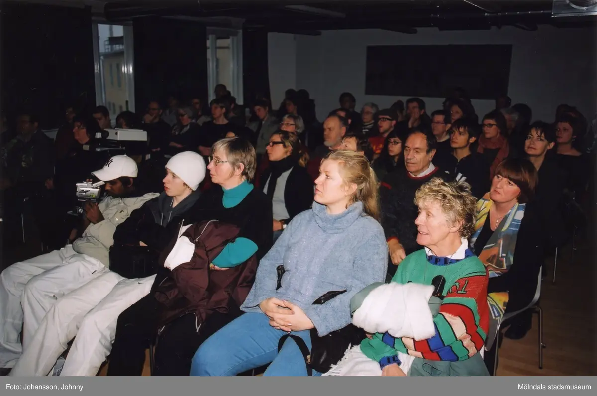 Besökare lyssnar på en föreläsning om graffitikultur i "Stora konferensen" på Mölndals museum, år 2003. Andra raden, längst till höger, sitter museichef Mari-Louise Olsson. I samband med invigningen av graffitiutställningen "Alltså finns jag".