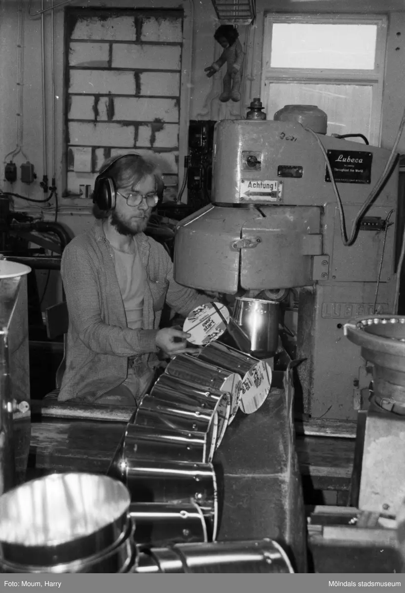 Waldts Emballage i Kållered, år 1984. "Lasse Enström ser till att burkarna förses med lock."