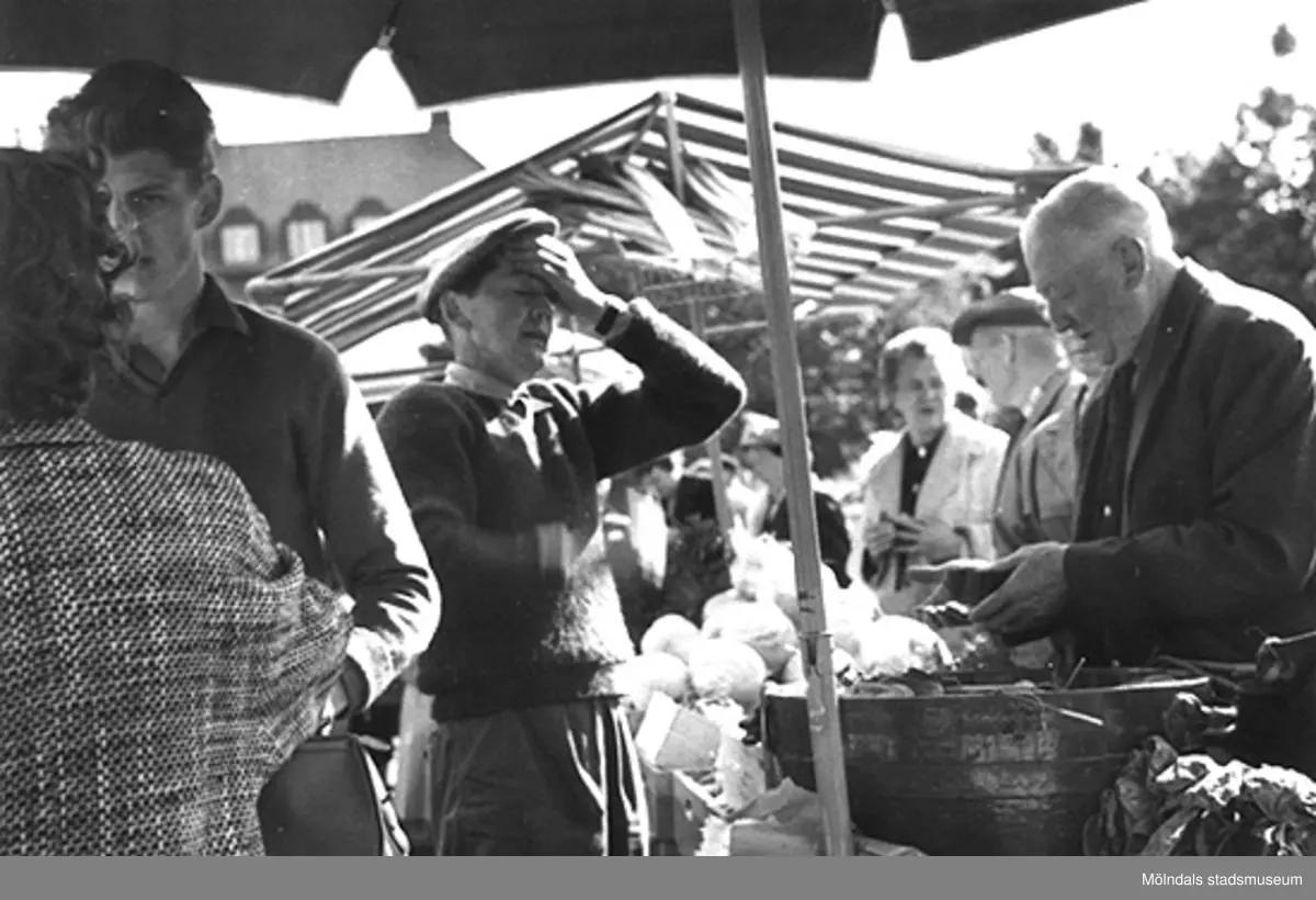 Torghandel på Nya torget, 1960-tal. Man ser Evert Andersson (i keps) från Fässberg Västergården. I bakgrunden skymtar taket på Kvarnbyskolan.