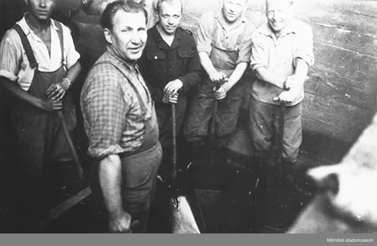Estländska män rensar kanalen i Lindomeån år 1955. Närbild från kanalrensningen utförd av män som i vanliga fall arbetade i färgeriet. Se föregående foto: 2002_0961.