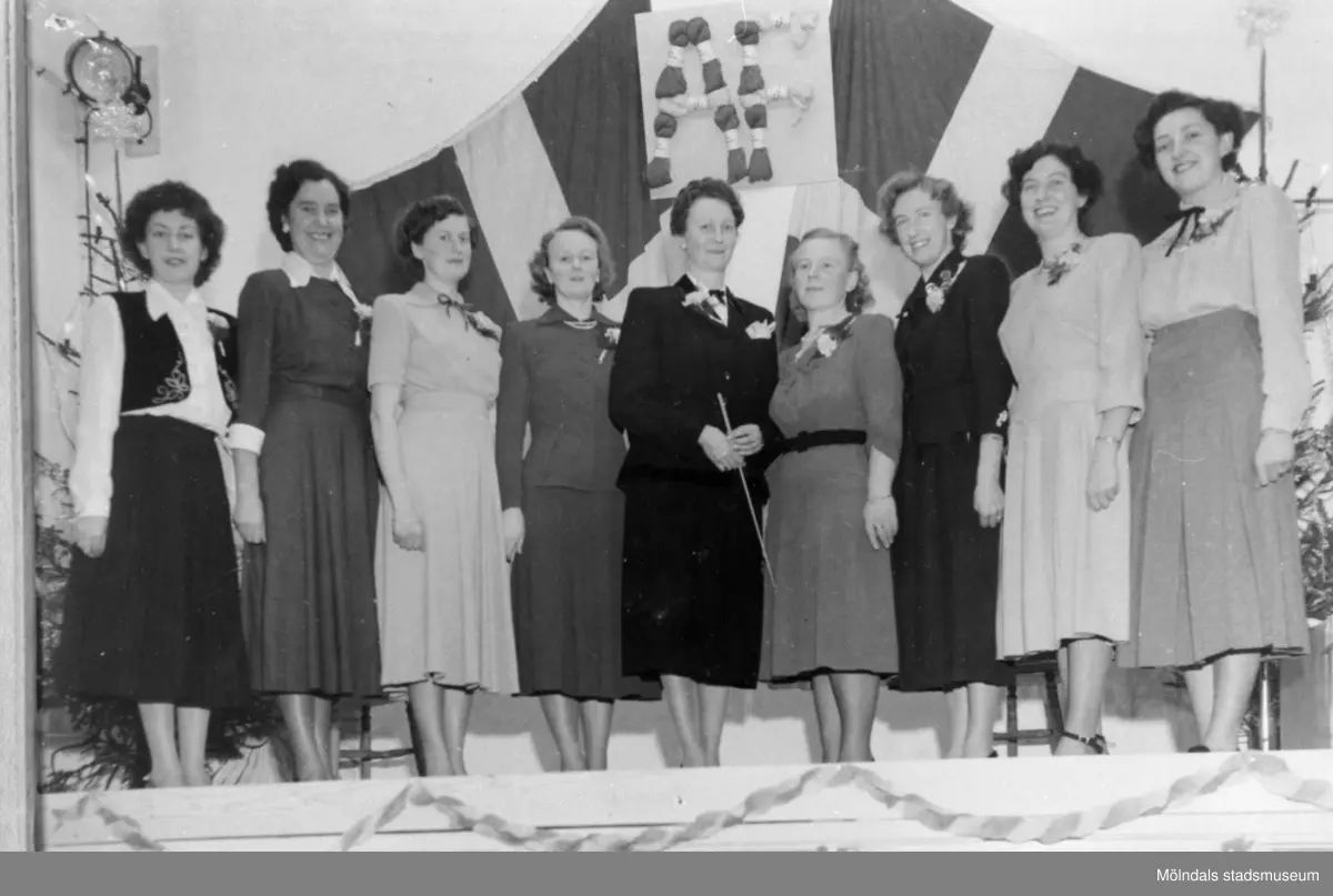 Lindakören med Märit Åshammar. Anderstorps fabriker 1949. I bakgrunden syns flaggmontage med bokstäverna AF. Dessa är formade av härvlat garn. (Härvel = ett textilredskap som består av en roterbar garnställning av trä, oftast på fot. Känt sedan vikingatid.)
