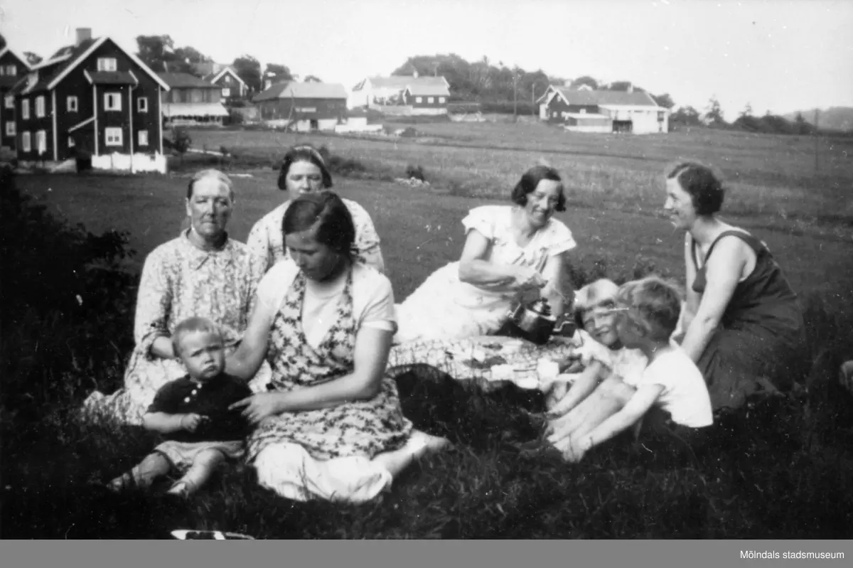 Arbetarkvinnor och barn fikar i gröngräset nedanför arbetarbostäderna i Annestorp.