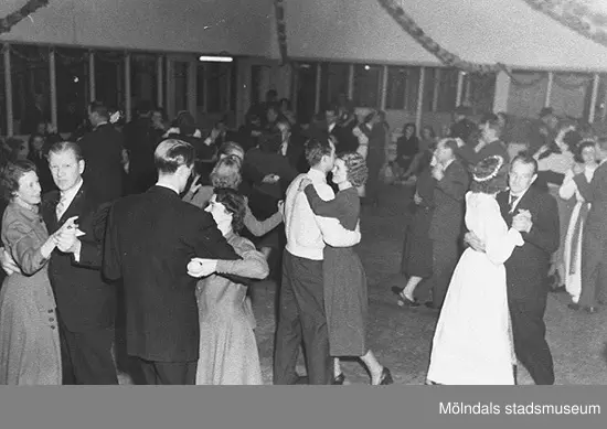 Dans i färgeriet på Luciadagen. Detta var en årlig tradition och en av arbetslokalerna gjordes då om till dansgolv. Slutet av 1940-talet.